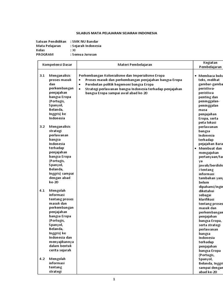 Silabus Sejarah Indonesia Kelas 10 / Silabus Mata Pelajaran: Sejarah Indonesia: Sumber Belajar : Acuan 11 komponen penggunaan dana bos pada 8 standar program absen siswa sd